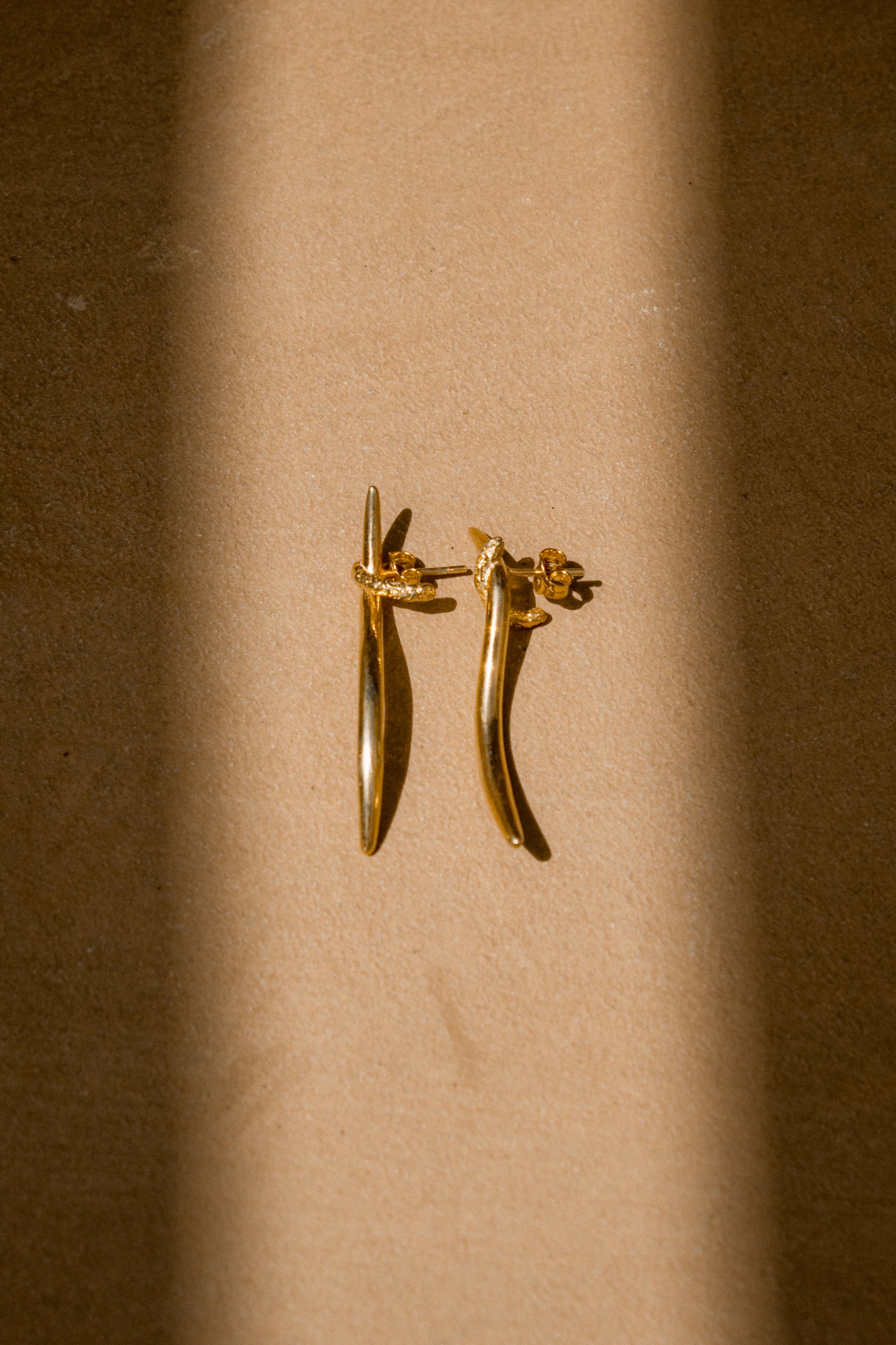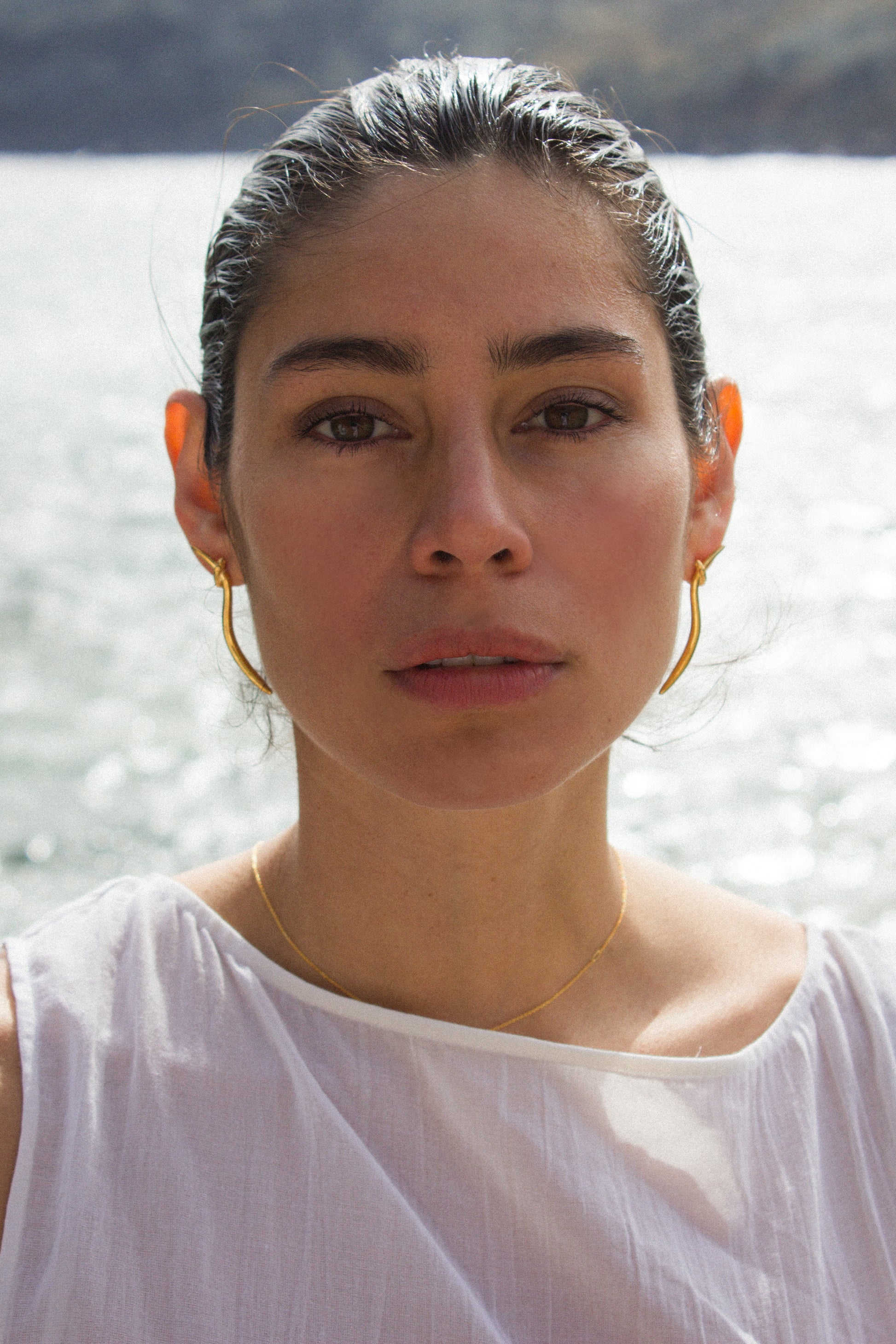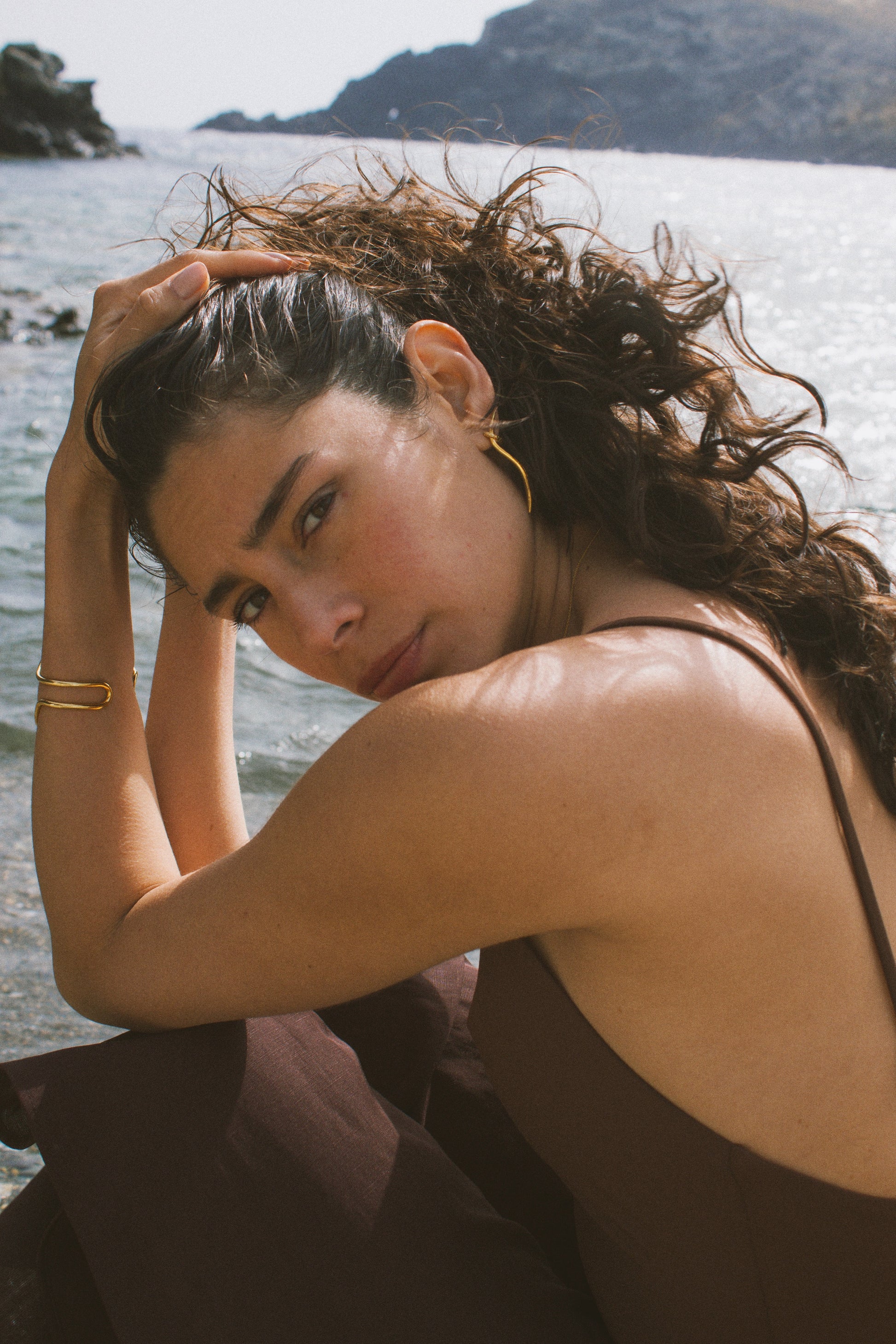 Hechos a mano en España con plata de ley 925 y un baño de oro de 24k, los pendientes Andros se inspiran en el colgante Delos, incorporando una forma curva texturizada. Una pieza discreta pero con presencia, que refleja el equilibrio entre sencillez y diseño.
