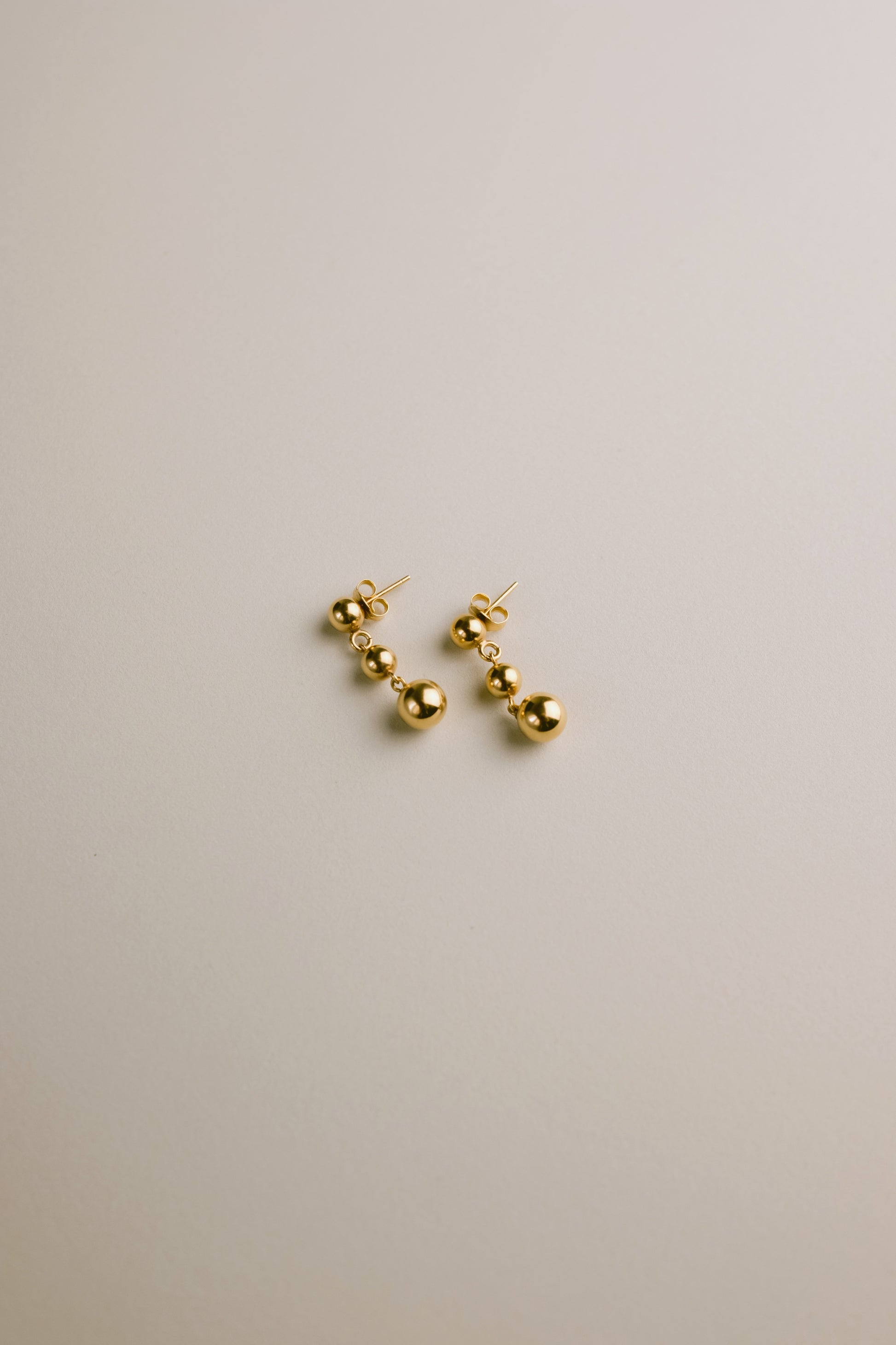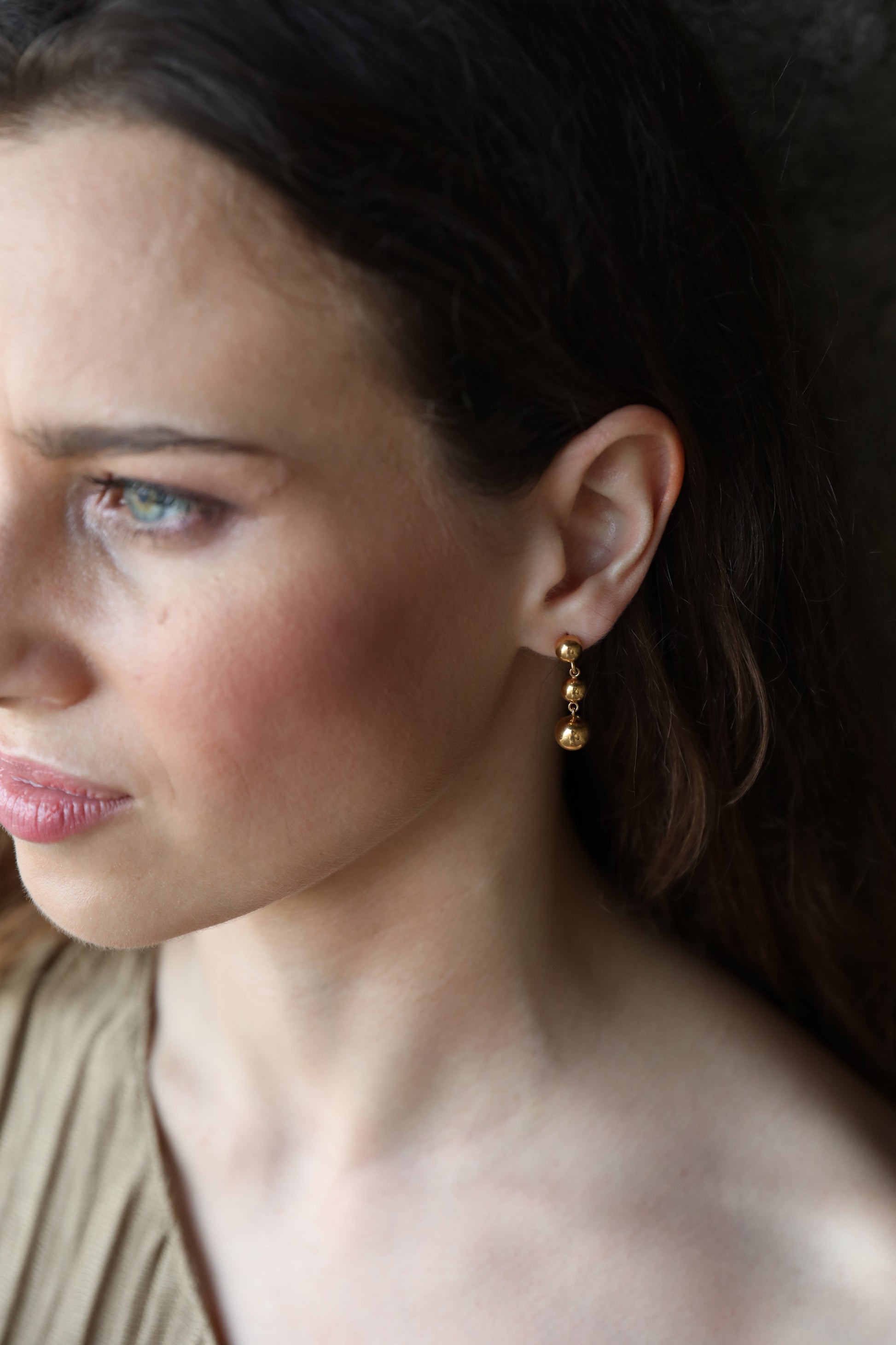Hechos a mano en España en plata de ley 925 y un baño de oro de 24k, los pendientes La Vila están compuestos de tres esferas que crean el balance perfecto. Son ideales para darle un toque especial a tus looks diarios.