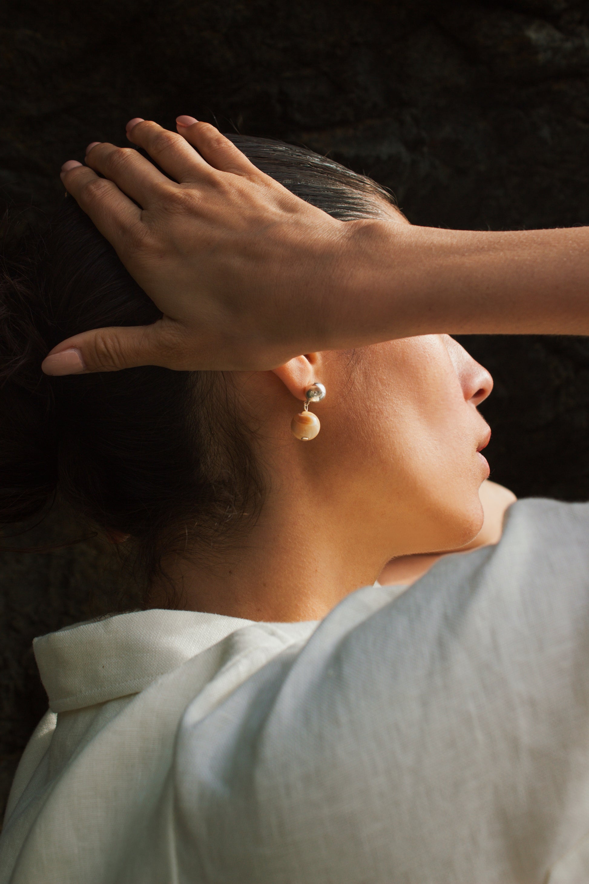 Hechos a mano en España con piedras naturales de nácar marrón y plata de ley 925, los pendientes Naxos forman parte de la colección limitada Cyclades. La singularidad de cada piedra los convierte en una pieza única.