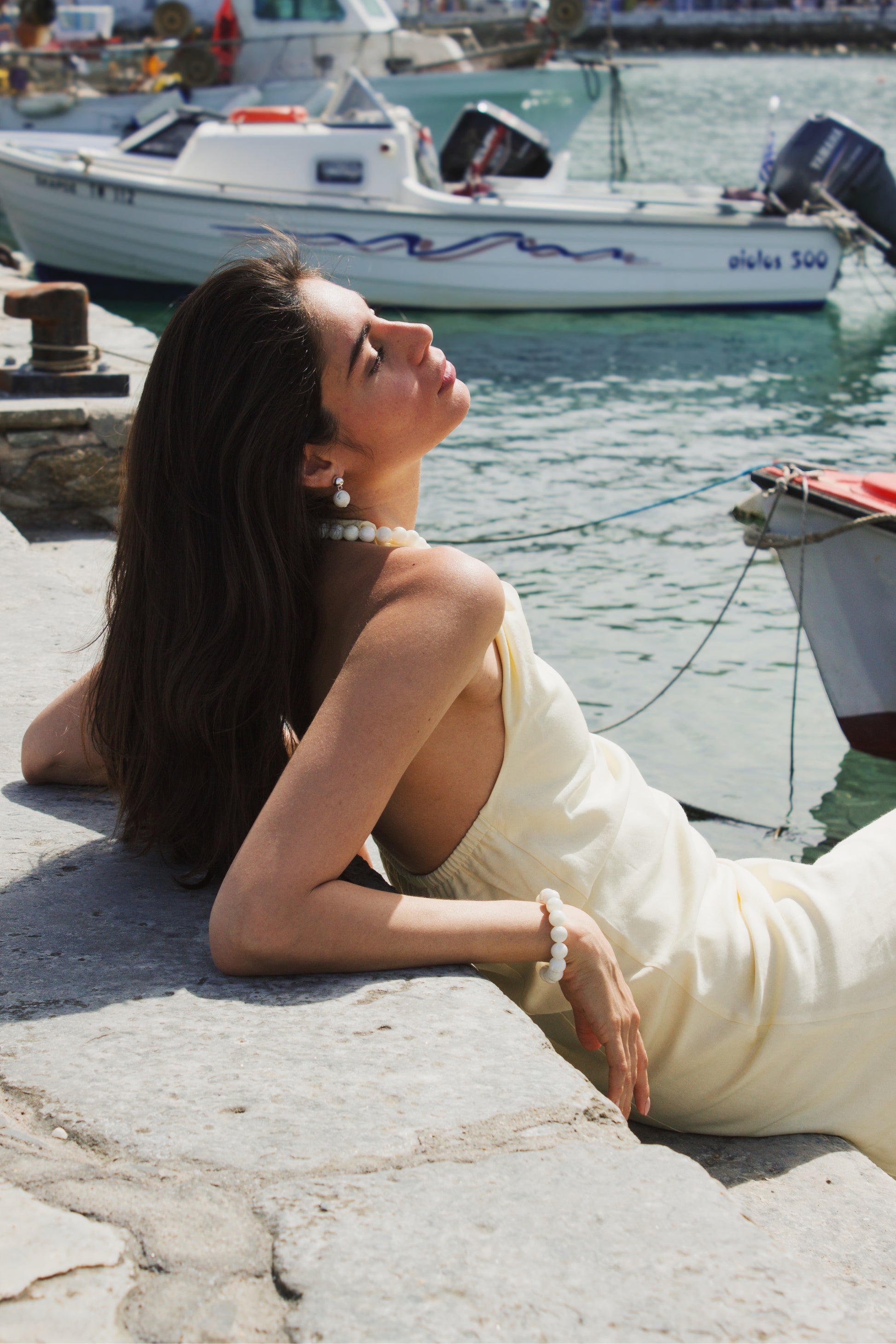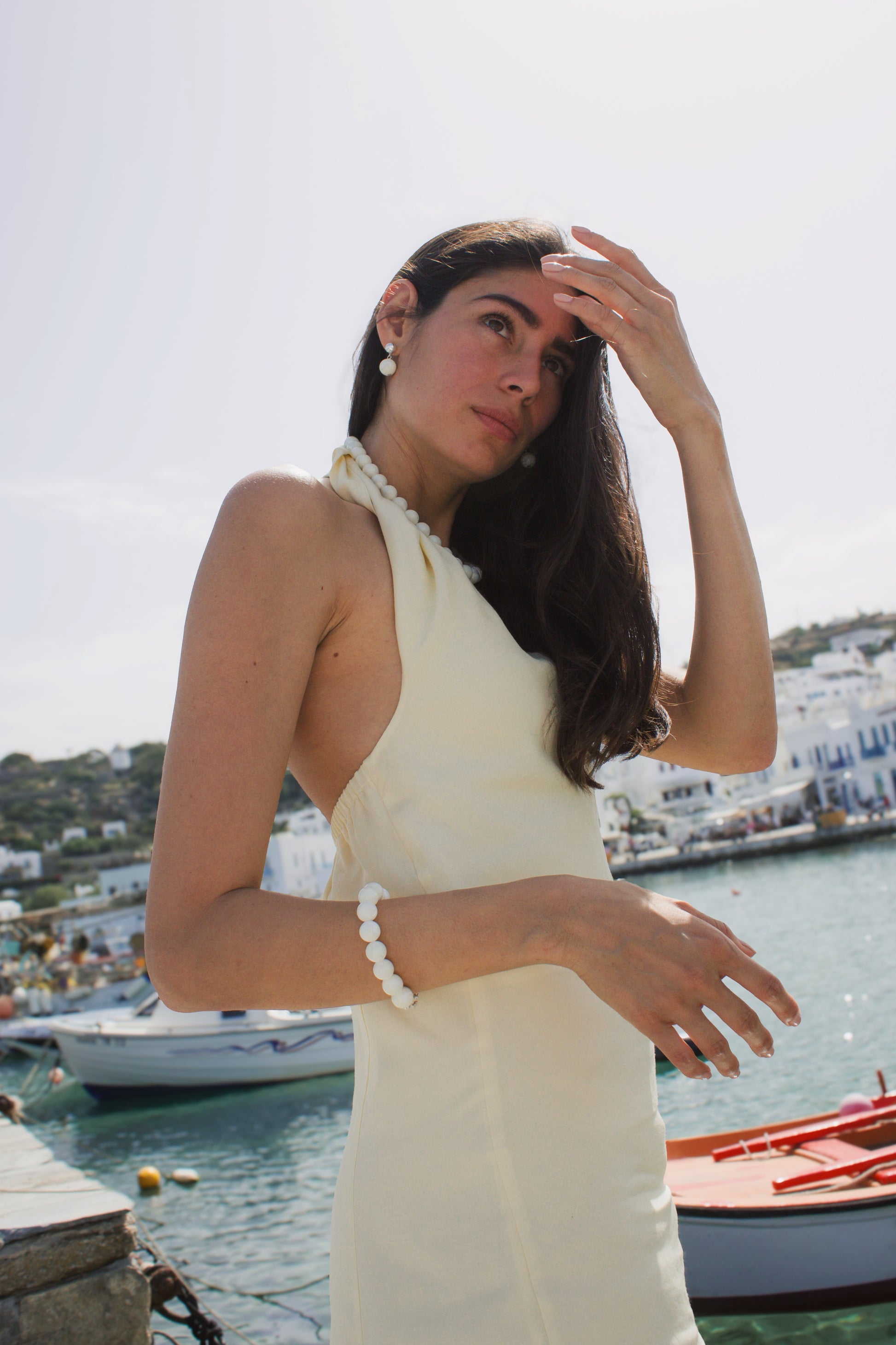 Hecha a mano en España con piedras naturales de nácar y plata de ley 925, la pulsera Naxos forma parte de la colección limitada Cyclades. La singularidad de cada piedra la convierte en una pieza única.